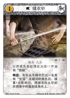 :在你从手牌中打出一名具有“坚强”关键词的角色后,横置1点影响力,将缝衣针从你的弃牌堆中附属到该角色上。